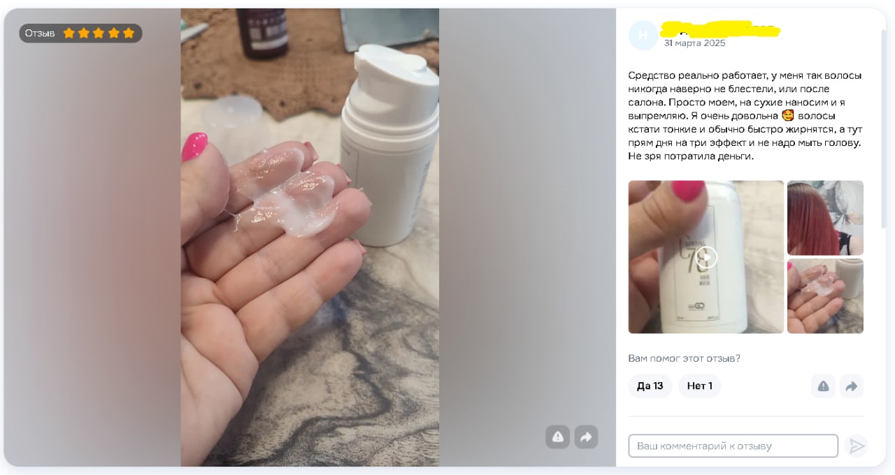 Работаю с волосами, пробовала много средств. Эта маска приятно удивила — эффект как после салонного ухода.